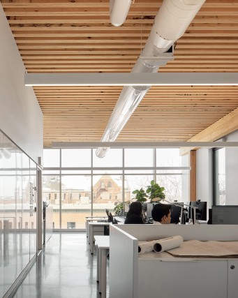 Pour l’agrandissement, des membres de l’équipe se sont donné le défi de construire en bois à un coût comparable à celui d’une structure en béton. Le développement d’une solution novatrice composée d’une structure mixte d’acier, de béton et de bois d’ingénierie qui a permis au projet de se qualifier au Programme de vitrine technologique pour les bâtiments et les solutions innovantes en bois du MFFP. Depuis la rue Rachel, la façade vitrée expose la structure de bois, tout en offrant une vue plancher-plafond aux employés. Le soir venu, le volume devient une boîte lumineuse, théâtre de l’activité qui s’y déroule.