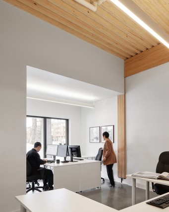 L’aménagement d’une grande aire ouverte au rez-de-chaussée offre plusieurs possibilités. À la fois un espace de travail flexible et un lieu de rassemblement, on y a aménagé des postes de travail non assignés et une porte de garage pour la tenue d’événements. Élément signature, la structure de bois au plafond anime l’espace et suggère un point de rassemblement. En plus d’avoir des propriétés acoustiques et d’intégrer les appareils d’éclairage, elle offre une atmosphère chaleureuse et reposante. Clin d’œil au programme d’identité de la firme par sa grille orthogonale et à la structure de l’agrandissement par l’utilisation du bois, ses détails d’assemblage rappellent aussi des pièces de mobilier dessinées et fabriquées à l’interne il y a plusieurs décennies.