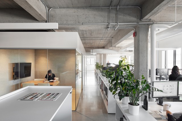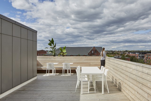 Le nombre de postes de travail a été augmenté sans réduire nos standards de dimensions et l’offre aux employés a été largement bonifiée. De nombreux éléments ont été ajoutés ou redessinés : une aire de repas spacieuse avec une cuisine et un comptoir café, un toit-terrasse, de nouvelles salles de réunion vitrées équipées pour les vidéoconférences —dont une grande salle multifonctionnelle pourvue d’une cloison de verre rétractable—, une nouvelle réception, une nouvelle matériauthèque, un atelier consacré à l’idéation et à la confection de maquettes et d’objets, un coin barista avec cuisine d’appoint, un rangement intérieur pour les vélos et une douche pour nos cyclistes.